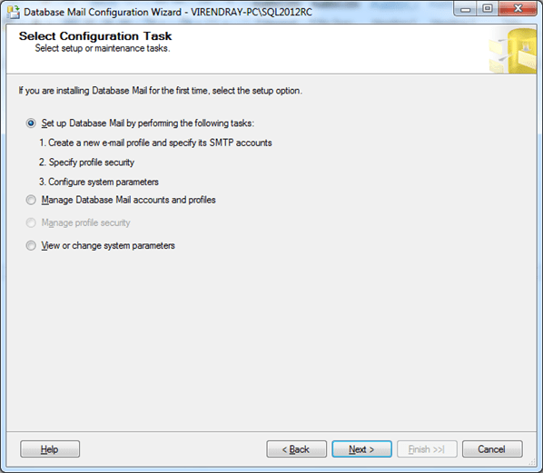 Choose Set Up Database mail by performing the following tasks :, Then Next
