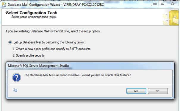 If you are configuring database mail first time, it will show as …. Click on Yes.