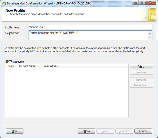 Give Profile Name ( Here profile name is VirendraTest and click on SMTP’s Account ADD button, It will shows New Database Mail Account