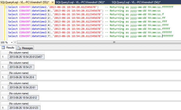 To resolve this, new data type DATETIME2 introduced from SQL Server 2008 onwards and beauty of DATETIME2 is that its supports fractional precision upto 7 digit. Let See examples