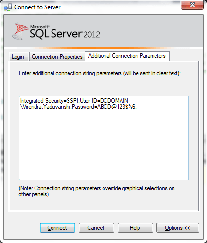 I would like to use User Name as DCDOMAIN\Virendra.Yaduvanshi, to do this just click on Option button, then Select Additional Connection Parameters tab, and write there your additional connection string as below image,