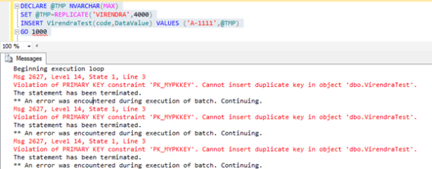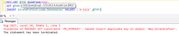 VirendraTest(code,DataValueVALUES (‘A-1111’,@TMP)