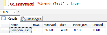sp_spaceused ‘VirendraTest’ true