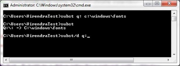 The subst command is used to map a local folder just like a Network drive. Just execute the subst command, followed by the path of the folder which need to appear as a drive. For example, let’s say you want your C:\Windows\Fonts folder to appear as the Q: drive. Just execute subst q: c:\windows\fonts and you’re set!