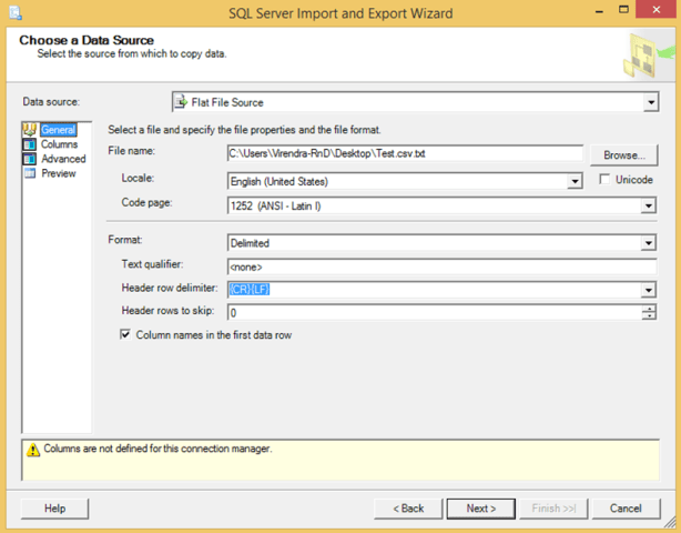 Step 2 – Select Data source as ” Flat File Source” , then Browse CSV file.