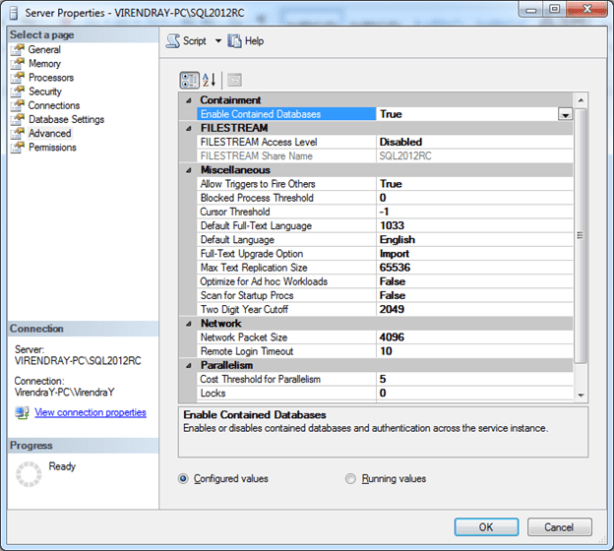 LOG ON (NAME=N’VIRENDRATEST_log’,FILENAME=N’D:\TestDataBases\VIRENDRATEST_log.ldf’,SIZE=1024KB , FILEGROWTH = 10%)