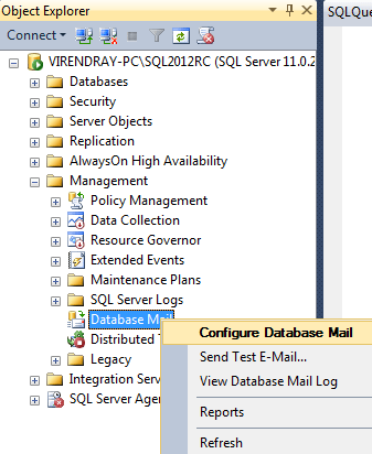 Click on your SQL Server Instance ->Management->DatabaseMail->Right Click and Select Configure Database Mail