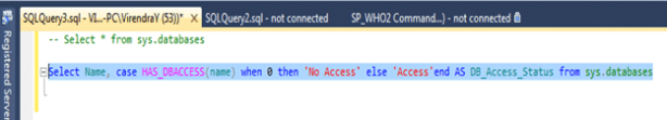 Select Name, case HAS_DBACCESS(name) when 0 then ‘No Access’ else ‘Access’end AS DB_Access_Status from sys.databases
